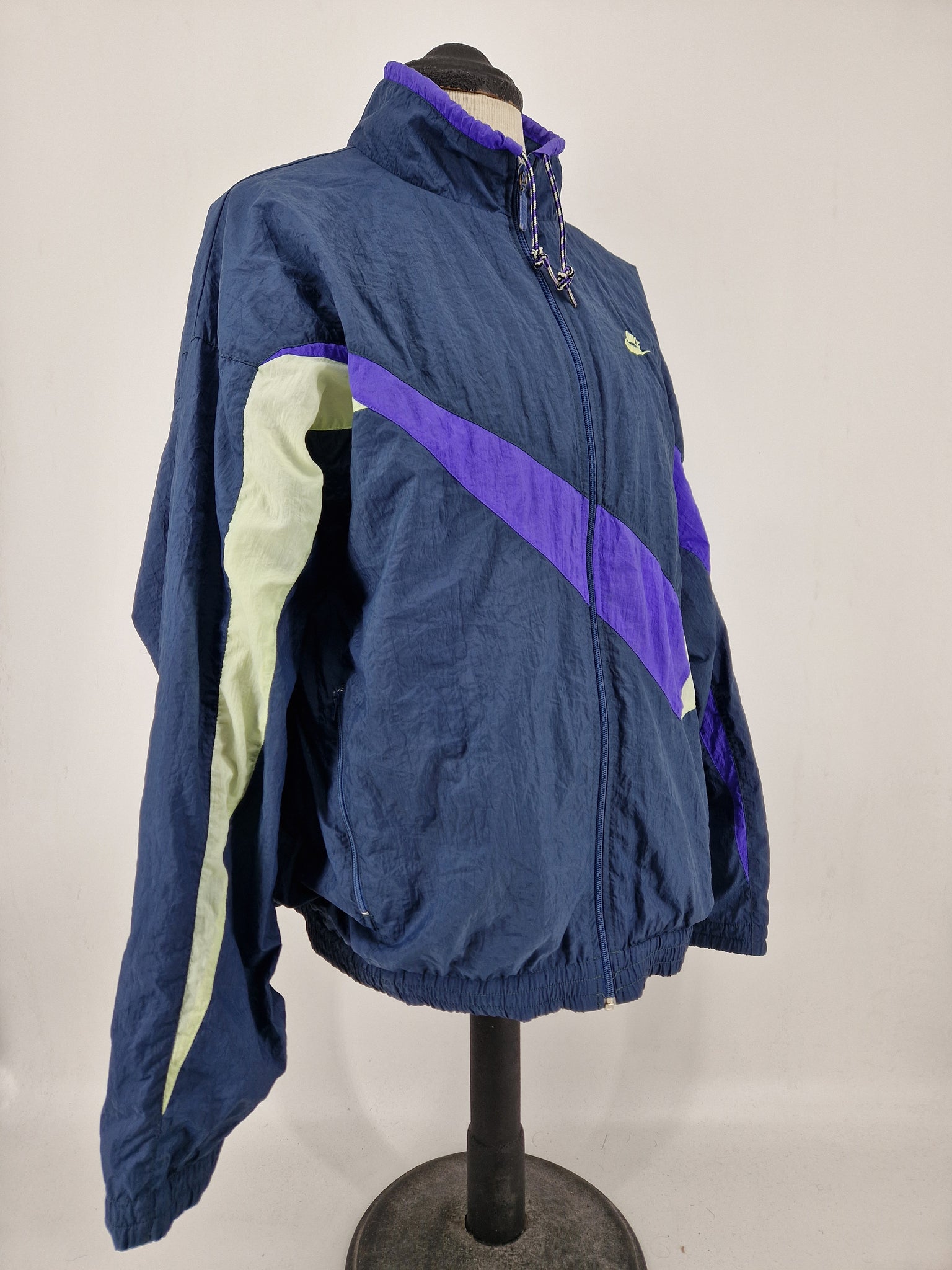 This classic vintage Nike track top is sure to be the highlight of your wardrobe. With its navy purple yellow colorway, it stands out from the crowd and is sure to make a statement. This 90s Nike track top is made of premium, durable materials and features the iconic Nike Swoosh logo.